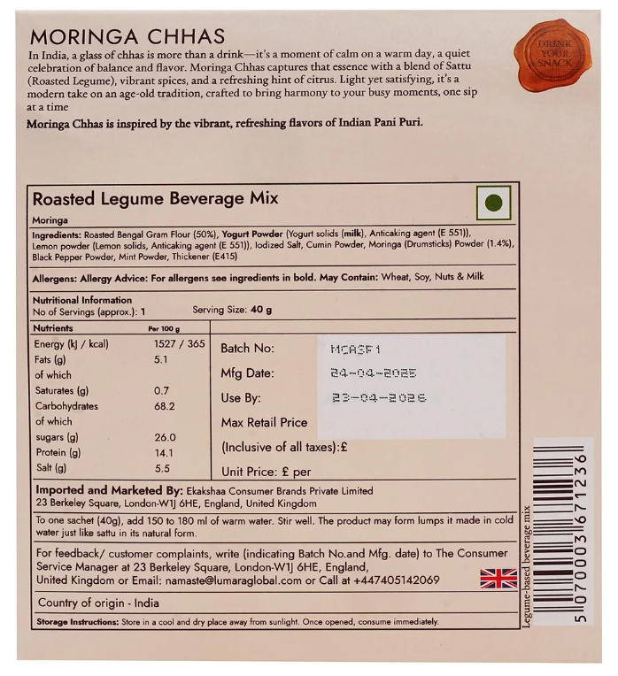 In India, a glass of chhas is more than a drink—it’s a moment of calm on a warm day, a quiet celebration of balance and flavor. Moringa Chhas captures that essence with a blend of Sattu (Roasted Legume), vibrant spices, and a refreshing hint of citrus. Light yet satisfying, it’s a modern take on an age-old tradition, created to bring harmony to your busy moments, one sip at a time. Moringa Chhas is inspired by the vibrant, refreshing flavors of Indian Pani Puri.